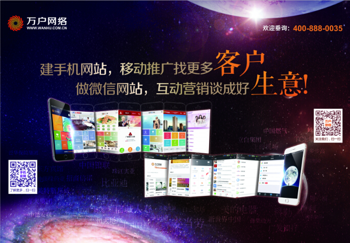 企業(yè)要進(jìn)行移動營銷的先決條件就是要有一個自己的移動網(wǎng)站,萬戶網(wǎng)絡(luò)作為17年老牌高端網(wǎng)站建設(shè)公司,建站服務(wù)涉及PC網(wǎng)站、手機(jī)網(wǎng)站、手機(jī)APP客戶端、微信網(wǎng)站等全系列網(wǎng)站建設(shè)服務(wù),我們稱之為全網(wǎng)站建設(shè)。全網(wǎng)站建設(shè)可以網(wǎng)羅PC網(wǎng)絡(luò)與移動網(wǎng)絡(luò)的全部商機(jī),決不放過一個漏網(wǎng)之魚。